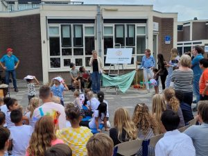 De nieuwe naam en het logo zijn maandag bij de start van het nieuwe schooljaar feestelijk gepresenteerd aan de leerlingen en hun ouders. En vanaf vandaag is het dan echt zo ver en gaat de school door als de Gooische Montessorischool. Marijn benadrukt dat er dan een nieuwe naam en nieuw logo zijn, maar dat ze nog steeds dezelfde school zijn, waarbij kinderen sterk worden en plezier krijgen in leren.