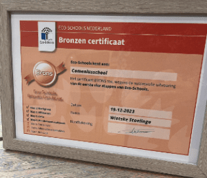 eerste van de drie certificaten uitgereikt: brons! Het certificaat werd uitgereikt door Maya Heinsbroek van Omgevingseducatie en uiteraard feestelijk omlijst met een presentje en iets lekkers voor het ecoteam.
